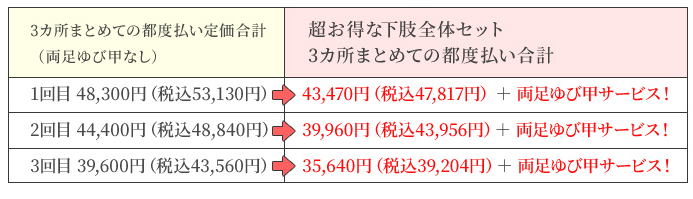 「お得な下肢全体セット」は、人気の下肢3カ所をまとめて脱毛すると、3回目までの都度払いがどんどんお安くなり、更に両足ゆび甲もサービス!というお得なプランです。