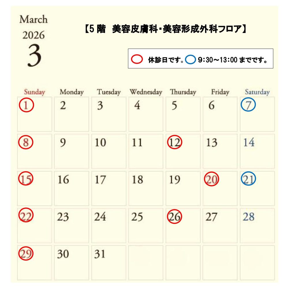 2026年【3月】の診療日・休診日スケジュールです